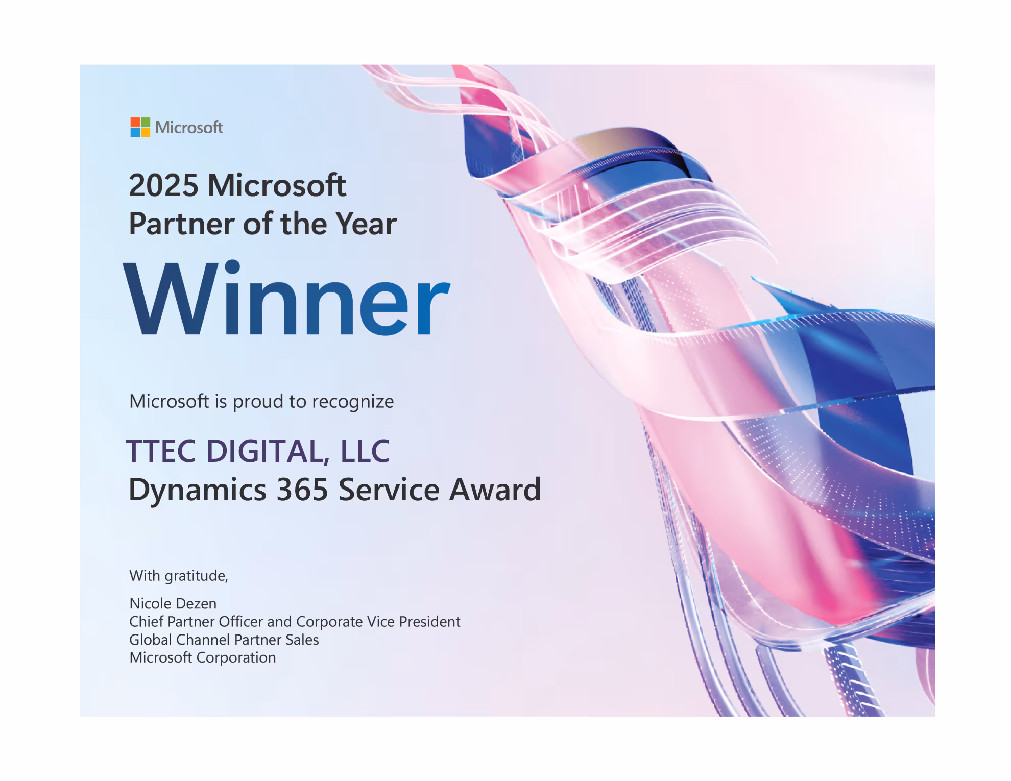 TTEC Digital is recognized among top Microsoft partners worldwide for our commitment to innovation and delivering outstanding customer solutions. In addition to Partner of the Year, TTEC Digital has also been named to Microsoft’s Inner Circle for AI Business Solutions for ten years in a row. Our deep expertise spans the full Microsoft ecosystem, including their Cloud and AI Platform (Azure, Fabric, Analytics) and AI Business Solutions portfolio (Dynamics 365, Copilot Studio, Power Platform, Teams), enabling us to deliver faster, smarter outcomes.